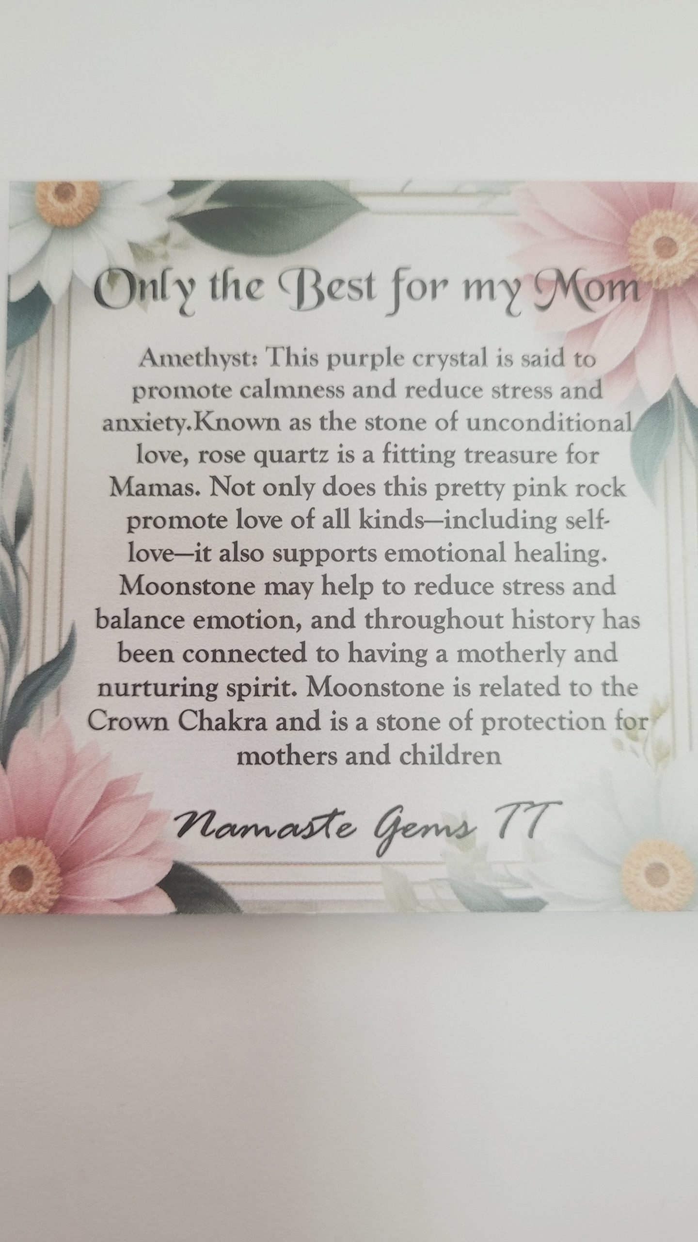 Moonstone and Sunsyone may help to reduce stress and balance emotion, and throughout history has been connected to having a motherly and nurturing spirit. Moonstone is related to the Crown Chakra and is a stone of protection for mothers and children.